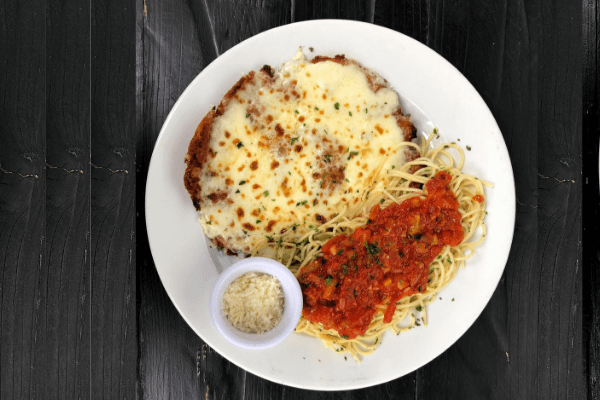 Chicken Parmesan , Spaghetti and breaded and baked chicken with marinara sauce and cheese